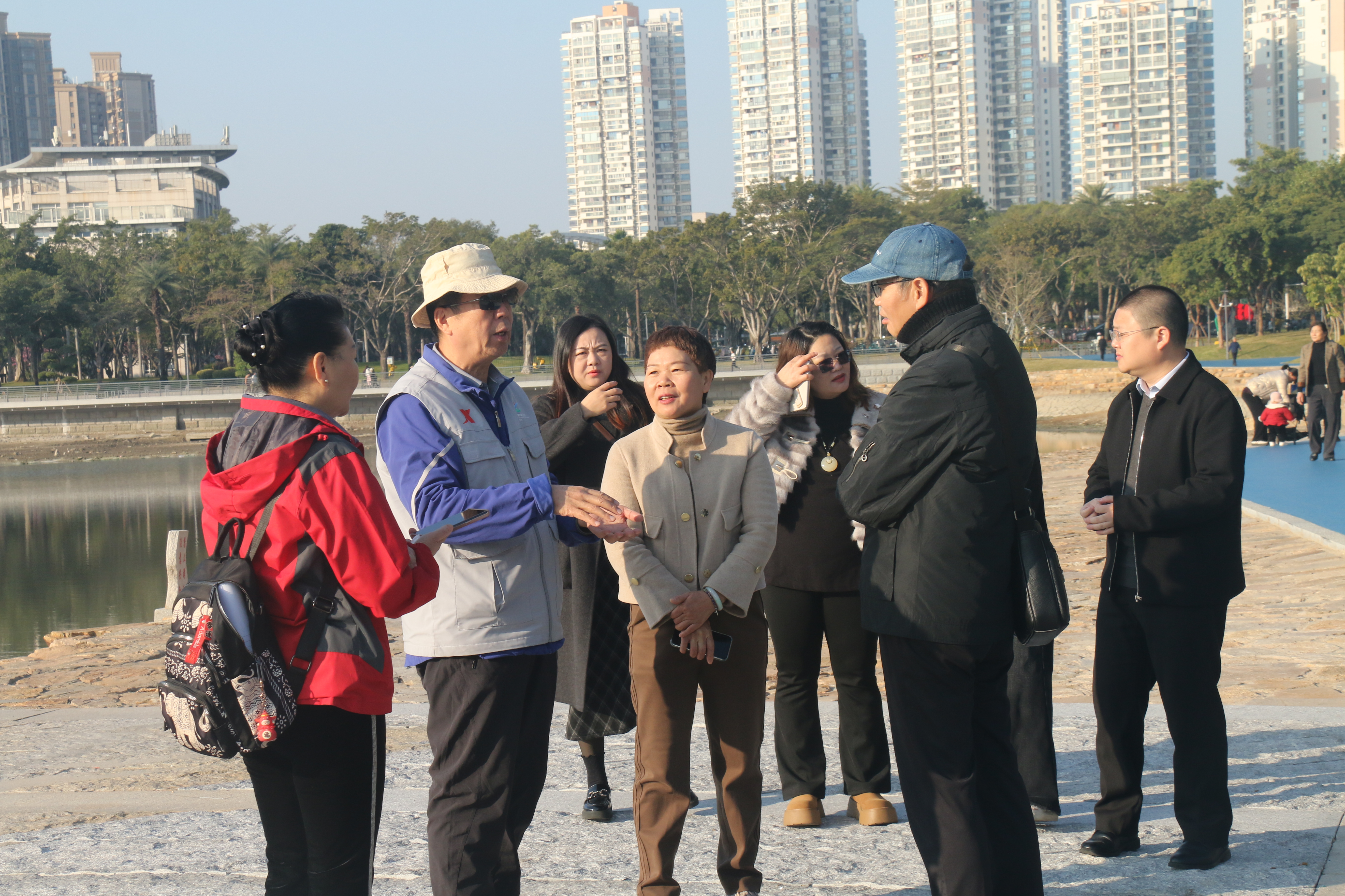 评审组一行,在社区工作人员引导下,首先实地考察了海沧湾湖周边的室外活动场所和运动场地,看到上班前,不少中青年人前来打卡;上班时间,老年人送完孩子纷纷前来打太极、练八段锦、跳广场舞等,或打扑克牌,或利用各种健身器械锻炼身体。在社区,看到室内有高尔夫球体验馆、乒乓球室、棋牌室、舞蹈室、多功能厅及各小区活动场所等硬件设施可满足老年人健身需求。评审组充分肯定了海沧区政府和老体协高度重视老年体育场所和设施建设。