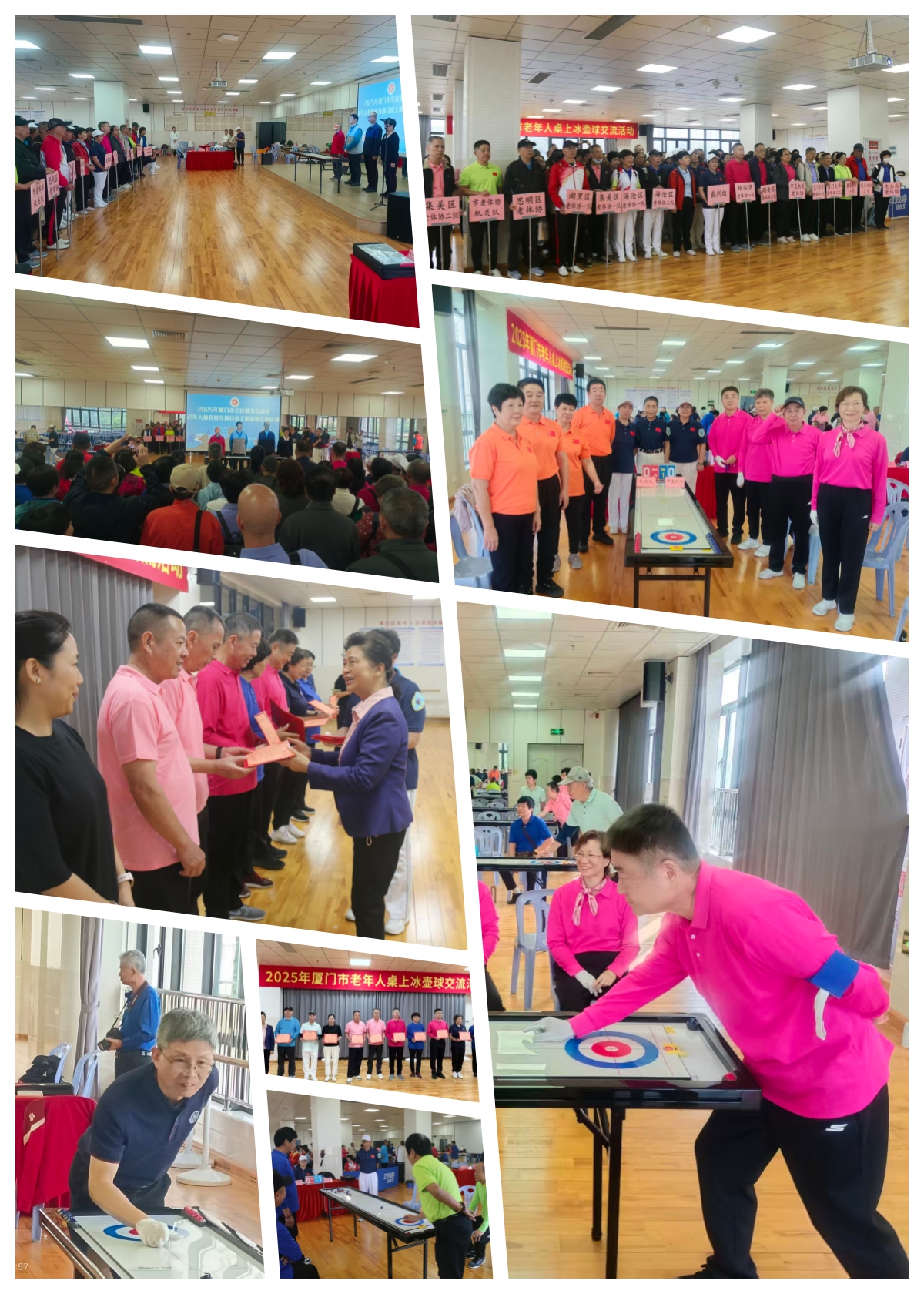 11月27日至28日,2025年厦门市老年人桌上冰壶球交流活动在海沧区沧江文体中心成功举行。来自全市各区、市直机关、厦门大学、行业系统等单位的16支代表队,近200名老年运动员同场竞技。厦门市老体协主席刘绍清、市老体协常务副主席王刚,海沧区老体协主席苏亮文、区老体协副主席钟少文,翔安区老体协常务副主席吴加建等出席交流活动。