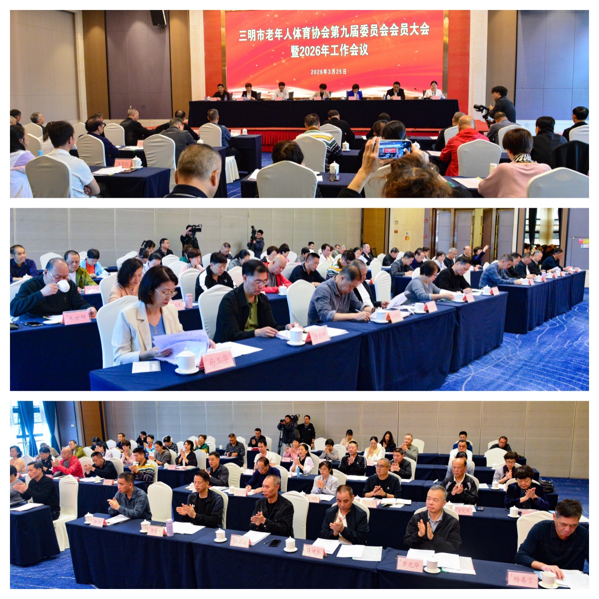 3月25日上午,三明市老体协第九届委员会会员大会暨2026年工作会议在三明天元大酒店举行。会议总结了过去五年全市老年体育工作,选举产生新一届领导机构,并对下一步工作进行部署。共有54名会员参加会议。市体育局党组书记廖才添出席会议并致辞,市委常委、组织部部长陈丽英出席会议并讲话。