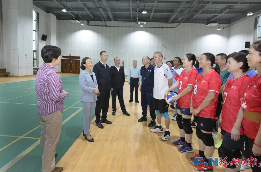 郭宁宁、吴贤德在市老年人体育活动中心与气排球爱好者交流。