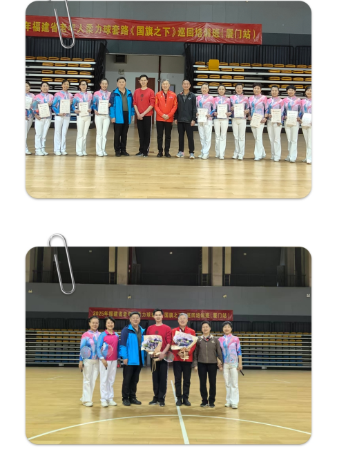 3月18日至19日,2025年福建省老年人柔力球套路《国旗之下》巡回培训班(厦门站)于厦门体育中心综合馆圆满收官。本次培训活动由省老体协主办,厦门市老体协承办,厦门市老体协柔力球专委会协办。活动吸引了来自思明区、湖里区、海沧区、集美区、同安区、翔安区以及华侨大学、厦门大学、卫健系统、厦门市老体协柔力球专委会等15支代表队,共75名柔力球骨干踊跃参与。他们满怀热忱,齐聚一堂,共同开启这场柔力球技艺提升与交流的盛会。