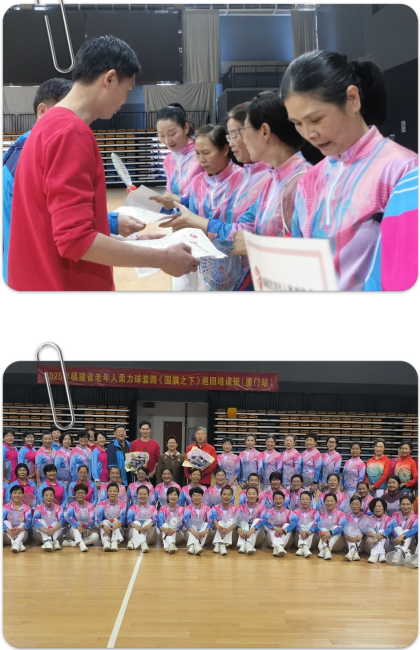 厦门市老体协主席刘绍清亲自到场观看培训汇报表演,当两位老师为厦门专门编创的“《国旗之下》爱我中华,舞动厦门,柔情绽放”,响彻赛馆上空时,全场热情沸腾。对学员们的学习成果给予了充分肯定和鼓励。培训结束后,市、区老体协领导为学员颁发结业证书,并与大家合影留念。(厦门市老体协柔力球专委会肖萍、范平)
