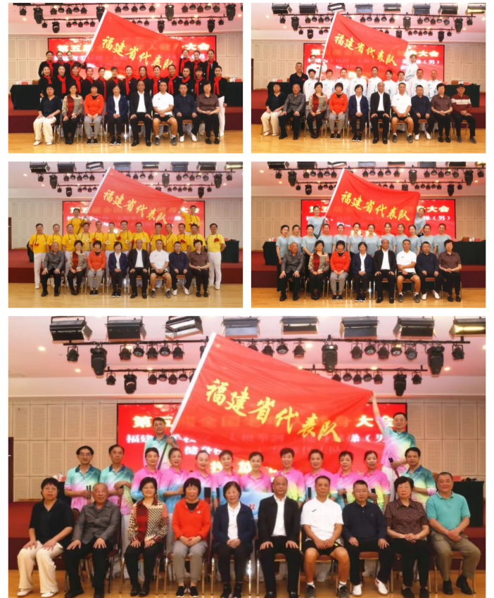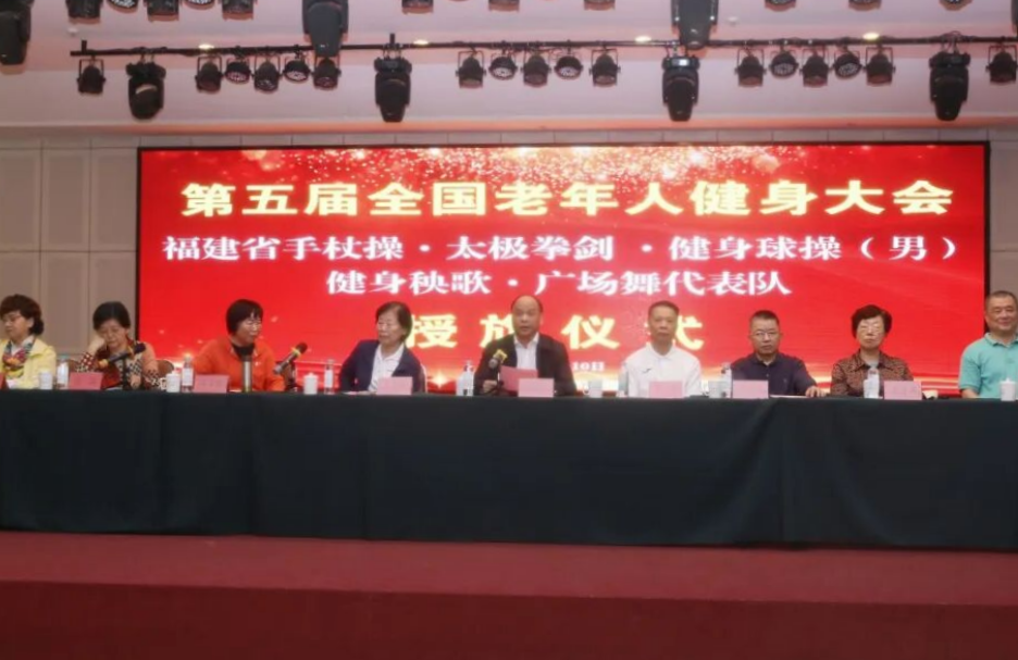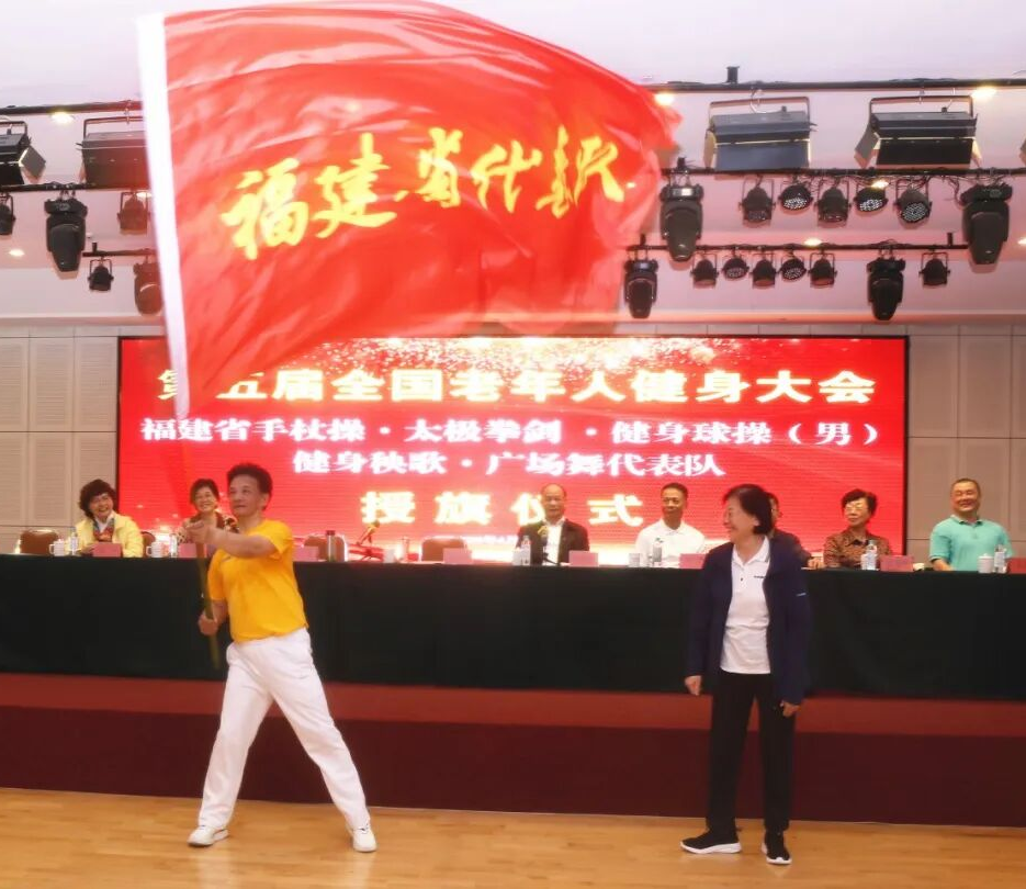 为积极备战第五届全国老年人体育健身大会,4月10日上午,福建省老体协在福州市老体中心多功能厅举行广场舞、男子健身球操、手杖操、太极拳剑、健身秧歌5个项目代表队的授旗仪式。省老体协主席王美香,福州市老体协主席阮孝应等出席活动,各参赛项目代表队教练、队员参加活动。市老体协常务副主席张涵主持活动。