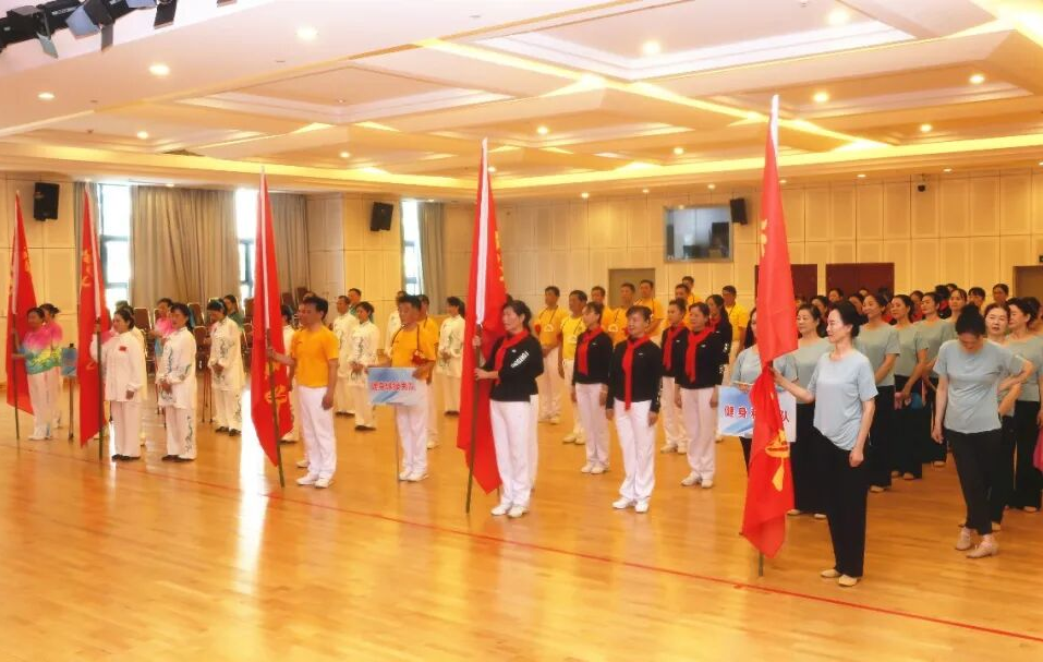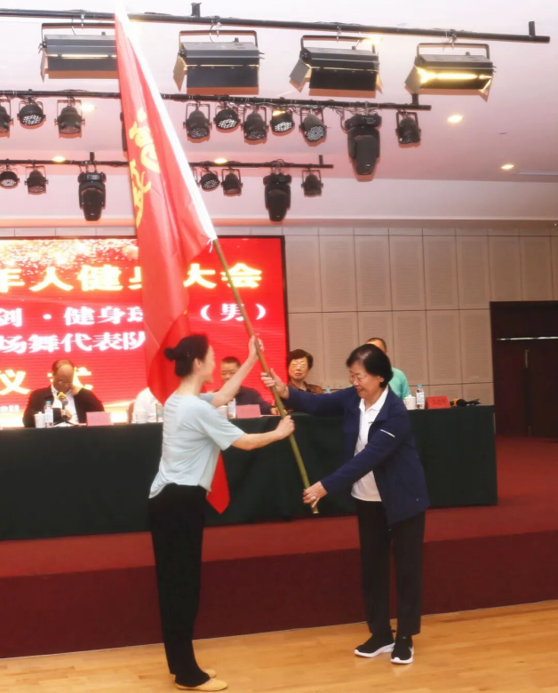 展示结束后,五支代表队整齐列队,接旗手依次就位。在激昂的音乐声中,王美香主席逐一为广场舞、手杖操、男子健身球操、太极拳剑、健身秧歌5支队伍授旗,接旗手分别接过旗帜,象征着责任与使命的传递。