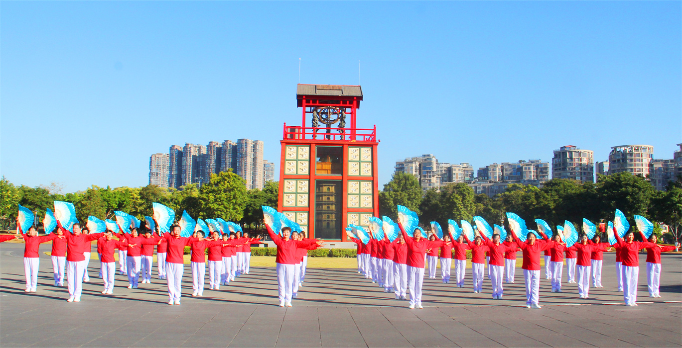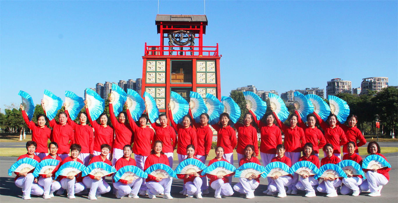 为检验学员的学习成果,培训班组织首期学员在苏颂公园水运仪广场前排练。温度虽低,寒风也烈,却挡不住学员们的热情与热血,红衫白裤,与红框的水运仪基座相辉映,蓝绸扇子与蓝天白云共翩跹,轻快欢畅笑颜比春风和暖,飞扬而整齐的舞姿、优美而多样造型堪比冬日炫目,每天学员们的排练成了苏颂公园里的一道亮丽的风景,吸引了很多在公园里锻炼散步游玩的群众。队员们辛勤和努力,凝聚成一帧帧优美的画卷,1月12日,学员们圆满完成表演视频拍摄,并上传市老促会审核,得到上级的好评。表演视频将由市老体协统一向中国老促会报名,并代表厦门市同安区参加中国老体协举办的“迎新年,贺新春”全国老年人体育健身线上系列活动。