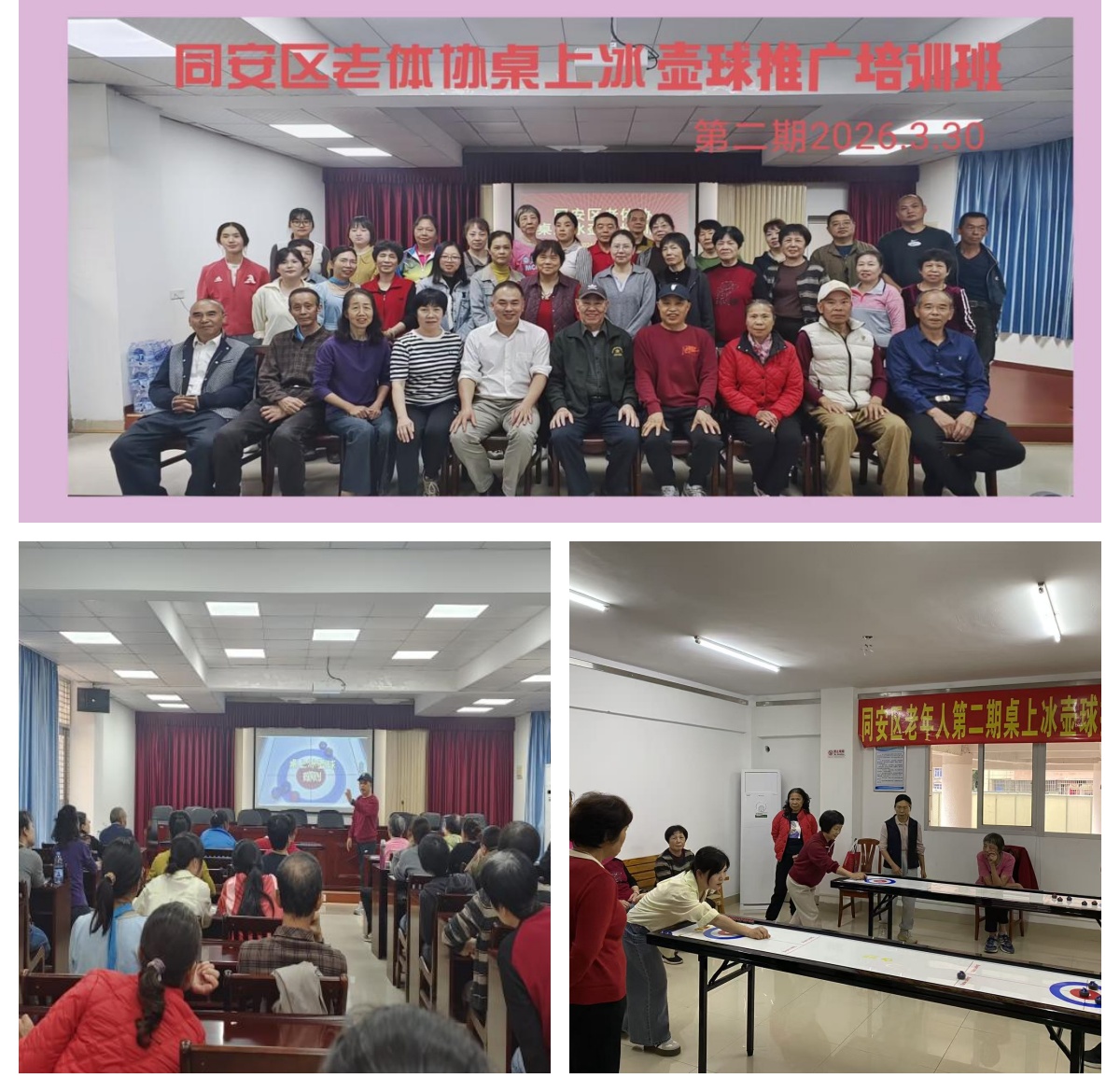 为普及推广桌上冰壶球运动,丰富老年人生活,提升老年健身骨干业务水平,2026年3月30日,同安区老体协在区老年活动中心举办桌上冰壶球第二期推广培训班。来自各镇(街)、社区及老体协各专委会、老年大学及老年活动中心的的40余名老年健身骨干参加培训 。学员们齐聚一堂,在方寸球台间挥洒热情、乐享智慧运动之趣,以壶为媒,共赴一场融趣味、健体与社交于一体的银龄之约。